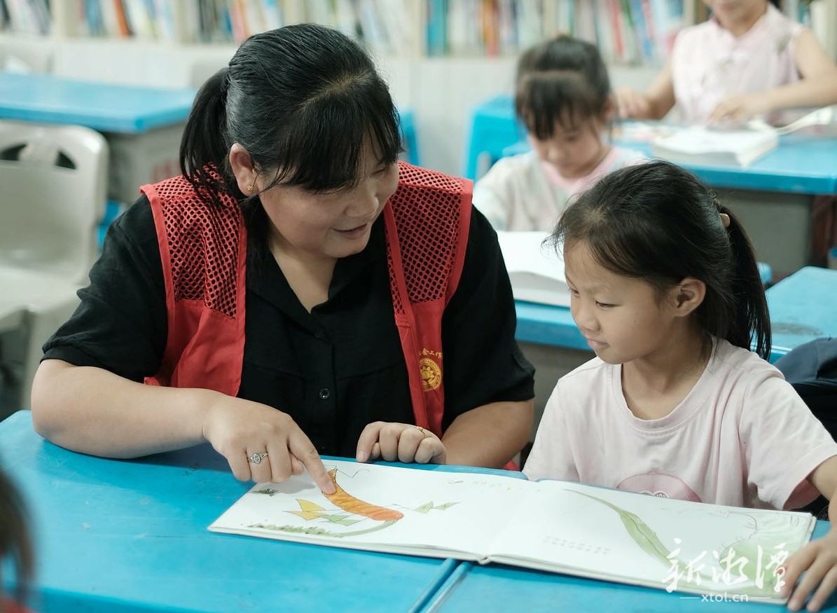 在谭家山镇紫竹村农家书屋,巾帼志愿服务队队员带着孩子们阅读绘本。(全媒体记者 邬雅琳 摄)