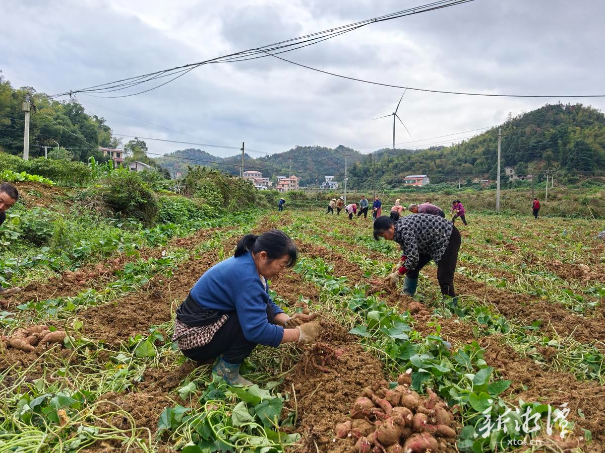 胡宗清的红薯田里,27名村民正在忙碌。他们弯腰挥锄,一垄垄红薯被翻出泥土,个头饱满,颜色鲜亮。“今年亩产约1500公斤,纯利润500元左右。”胡宗清语气中带着自豪。
