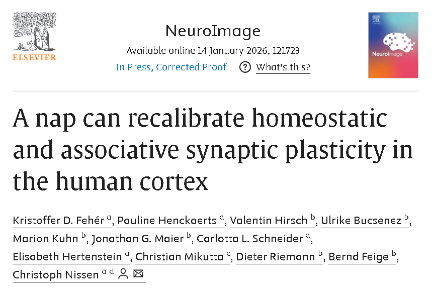 ①Fehér KD, Henckaerts P, Hirsch V, et al. A nap can recalibrate homeostatic and associative synaptic plasticity in the human cortex. Neuroimage. Published online January 14, 2026. doi:10.1016/j.neuroimage.2026.121723