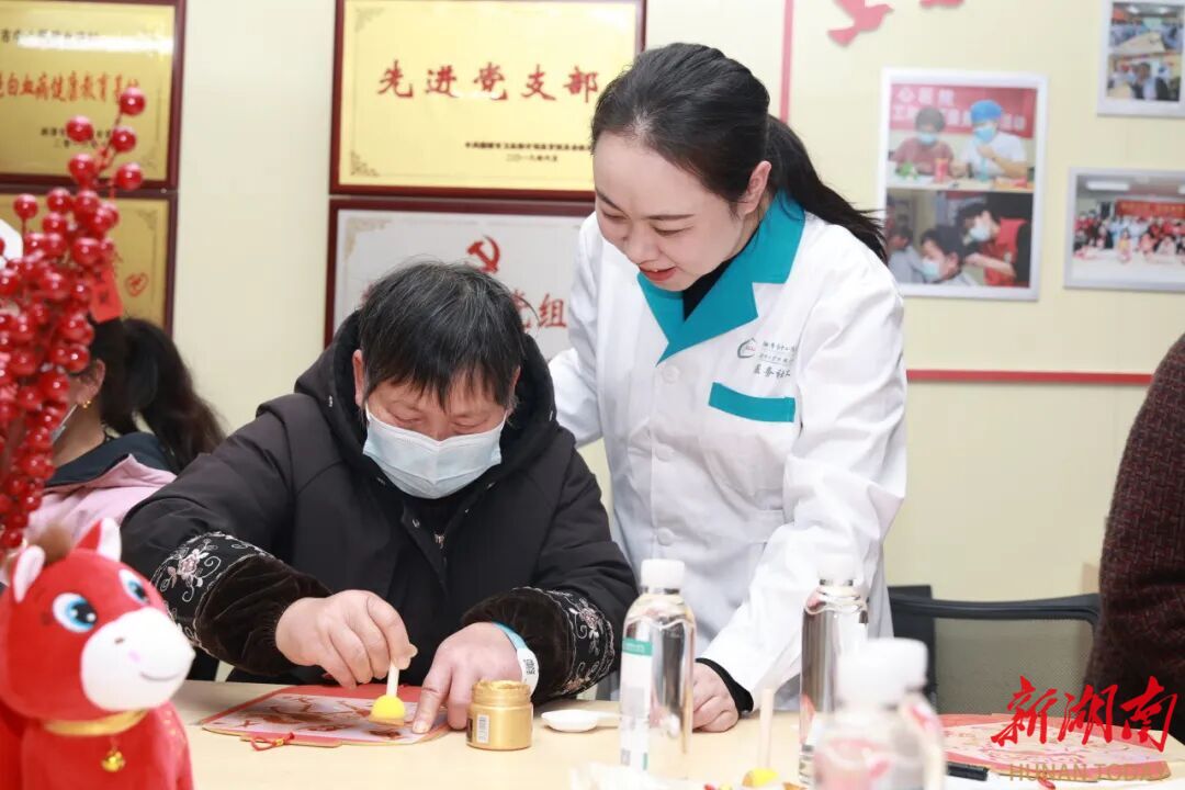 在精心布置的病房活动室,另一幅年意盎然的画面正在展开。喜庆的福牌分发到患者和家属手中,一场“绘福迎新春”的活动热闹开场。患者与家属起初有些生疏的手法,在医务社工与志愿者的耐心帮助下逐渐熟练。不一会儿,寓意吉祥的“福” “马到成功”等字与图案便跃然纸上。